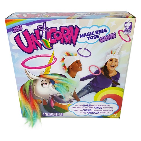 With the unicorn magic ring toss game players take turns trying to get their rings around their opponent s unicorn horn.
